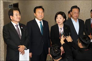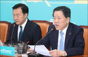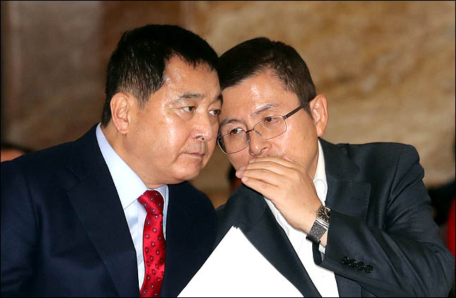황교안 자유한국당 대표와 심재철 원내대표가 18일 오전 국회 로덴더홀 농성장에서 열린 최고위원-중진의원 연석회의에서 귀엣말을 하며 무언가 논의하고 있다.