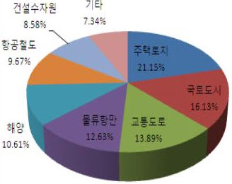 실제 주택·토지분야의 경우 21.15%를 차지하며 1위를 차지했다. 이어 국토·도시(16.13%), 교통·도로(13.89%), 물류·항만(12.63%), 해양(10.61%), 항공·철도(9.67%), 건설수자원(8.58%) 등의 순이었다.