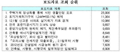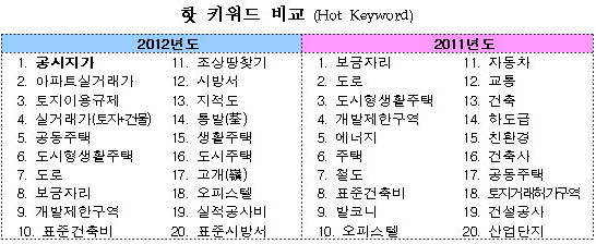 지난해 핫 키워드는 보금자리, 도로, 도시형생활주택, 개발제한구역, 에너지, 주택, 철도, 표준건축비, 발코니, 오피스텔 등의 순이었다.