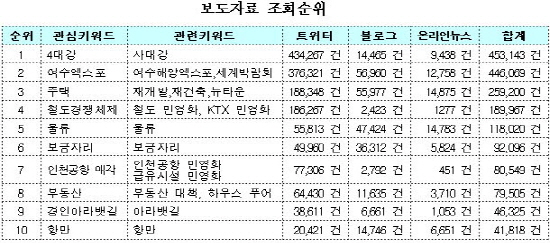 이밖에도 트위터, 블로그를 포함한 인터넷 상에서 국토해양과 관련해 가장 이슈가 된 관심 키워트는 '4대강', '여수엑스포', '주택(뉴타운, 재건축)', '철도경쟁체제', '물류' 등의 순이었다.