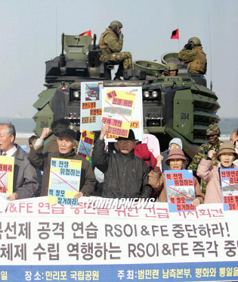 이들은 50여분간 ‘한반도 평화체제 역행하는 대북 선제 공격 연습을 즉각 중단하라’는 내용의 플래카드와 피켓을 들고 시위를 벌였다. 일부 회원은 미군 병사를 끌어당기며 “양키 고 홈” 등을 외쳤다. 이들은 시위 후 승합차 두 대에 나눠 타고 현장을 떠났다.