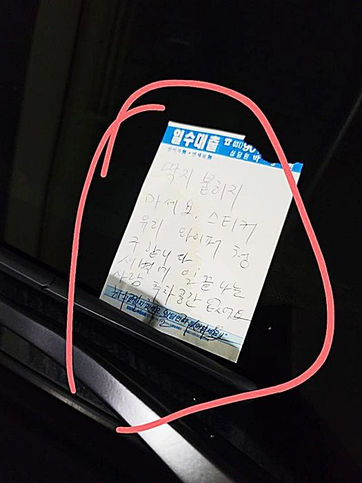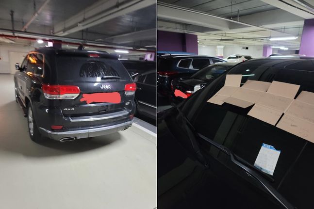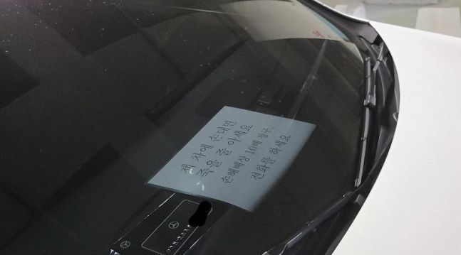 그가 공개한 사진에 따르면 검정색 SUV 한 대가 통로에 떡하니 주차돼 있다. 그런데 이 차량의 앞 유리에는 '딱지 붙이지 마세요. 스티커 유리 와이퍼 청구합니다. 새벽에 일 끝나는 사람 주차 공간 없어요. 해결책을 주세요'라고 적은 쪽지가 붙어있다.