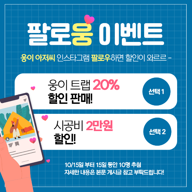 웅이아저씨 인스타그램 채널을 팔로우 또는 유튜브 채널을 구독해 해당 이벤트 게시글에 ‘좋아요’를 누른 후 ‘참여완료’라고 작성한 댓글을 캡처해 다이렉트 메시지를 보내면 추첨을 통해 10명에게 시공비 2만원 할인권과 웅이트랩 20% 할인권을 제공한다.