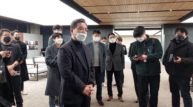 장재훈 현대자동차 사장(제네시스 사업부장)이 11일 경기도 용인 제네시스 수지에서 열린 제네시스 G90 언베일링 행사 이후 전시관으로 이동해 기자들의 질문에 답하고 있다. ⓒ데일리안 김민희 기자