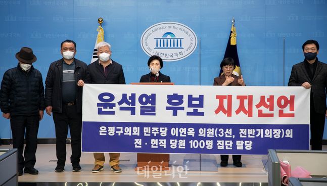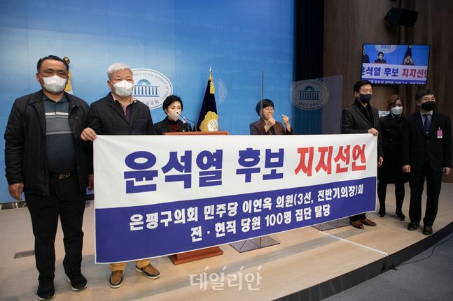 민주당 소속 이연옥 은평구의원을 비롯한 호남 출신 민주당원들은 10일 오후 국회 소통관에서 기자회견을 열어 집단탈당과 국민의힘 윤석열 후보의 지지를 선언했다. 이 구의원은 3선 기초의원으로, 은평구의회 전반기 의장을 지냈다.