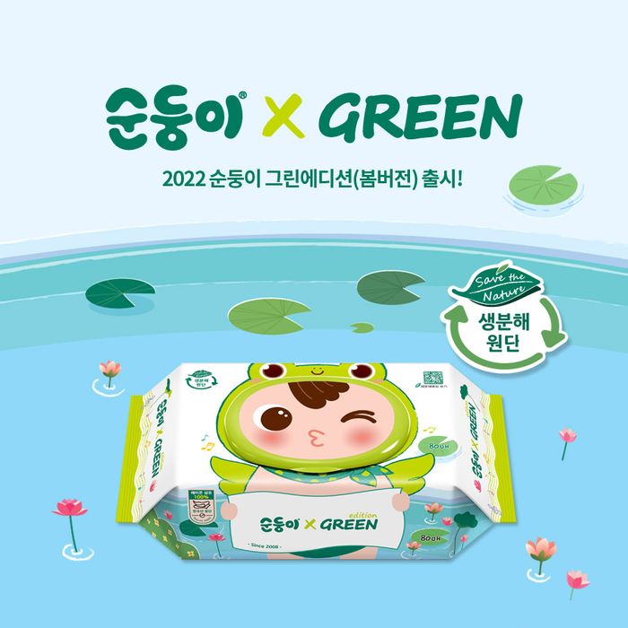 그린에디션 물티슈는 자연환경 보호의 일환으로 '수원 청개구리'를 모티브로 했다. 자연에서 100% 생분해 원단을 사용, 환경부 공식 생분해도 테스트 ISO 14855-1 통과한 것이 특징이다.