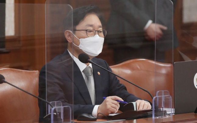 박범계 법무부 장관이 2일 오전 서울 종로구 정부서울청사에서 열린 국무회의에 참석해 김부겸 총리의 발언을 듣고 있다. ⓒ뉴시스