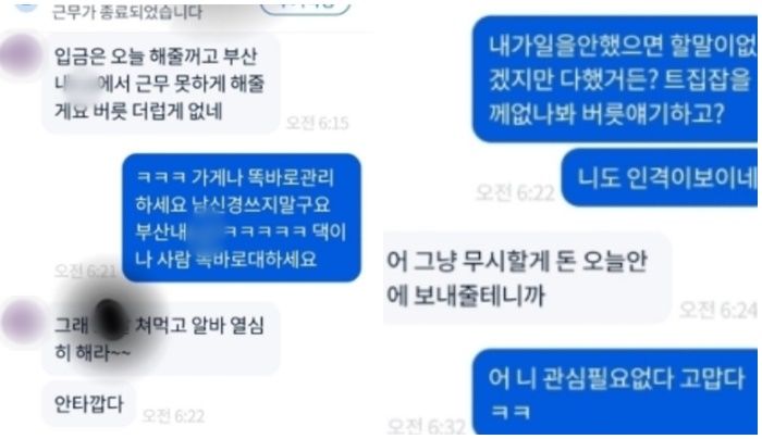 그러자 사장은 "(아르바이트 임금은) 오늘 입금 해줄 거고, 부산 내 편의점에서 근무 못하게 해주겠다"라며 "버릇 더럽게 없네"라고 받아쳤다.