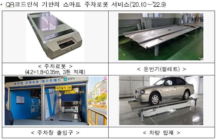 현재 주차로봇은 부천시에 위치한 노외주차장에서 2020년10월부터 실증하고 있으며, 주차로봇의 위치·경로인식, 안전장치 등의 운영 시스템을 검증하고, 안전성을 보완하고 있다.