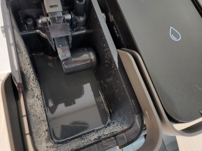 회전형 제품과 달리 좌우 양방향 스크래퍼로 긁어내듯 세척해서 이물질 제거에도 좋았다. 제대로 세척이 됐는지 확인하기 위해 도크 오수 통을 열었더니 손빨래를 한 것보다 더 시커먼 물이 채워져있었다. 물걸레 세척 후 더러워진 도크 내부도 자동으로 세척된다. 다만 판 쪽 거름망과 바닥 부분에 살짝 고이는 정도는 직접 손으로 닦아내야 했다. 오수를 빼는 과정에서는 소음은 다소 있는 편이다.