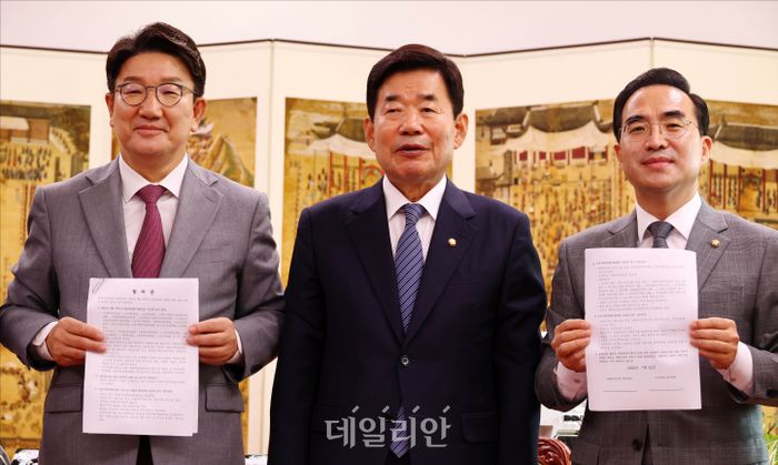 (왼쪽부터) 권성동 국민의힘 당대표 직무대행 겸 원내대표, 김진표 국회의장, 박홍근 더불어민주당 원내대표가 지난 22일 오전 서울 여의도 국회 의장실에서 국회의장 주재로 열린 제21대 하반기 국회 원 구성 협상을 위한 원내대표 회동에서 합의문을 들고 있다. (공동취재사진) ⓒ데일리안 홍금표 기자