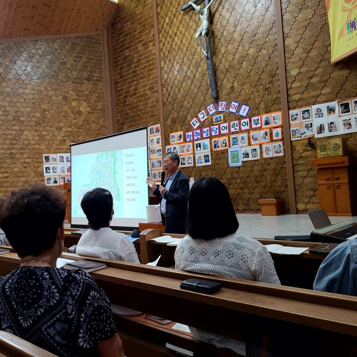 화도읍 창현성당에서 대책위 한 관계지가 골프장건립으로 인한 자연훼손에 대해 설명하고 있다.ⓒ대책위