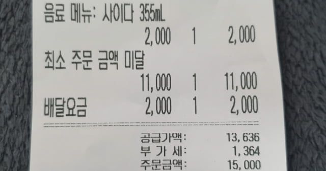 A씨가 첨부한 영수증 사진에서는 사이다 한 캔 가격 2,000원에 최소 주문 금액 미달 비용 1만 1,000원이 함께 결제된 것을 확인할 수 있다.