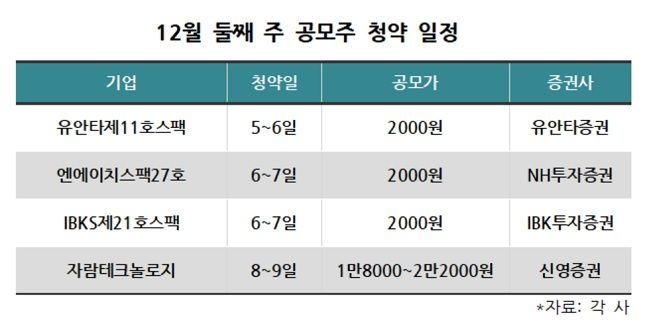 이외 유안타제11호스팩(5~6일), 엔에이치스팩27호(6~7일), IBKS제21호스팩(6~7일) 등 스팩주의 청약 진행과 함께 이번주 청약 일정은 마무리된다.