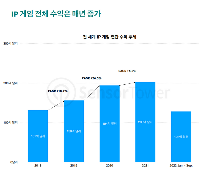 주요 IP 게임의 수익 점유율도 매년 상승 추세다. 2021년 전 세계 상위 100위 게임 중 IP 게임 수익은 121억 달러로 사상 최고치를 경신했다. 이전에는 2018년 81억달러, 2019년 95억달러, 2020년 114억달러 규모였다.