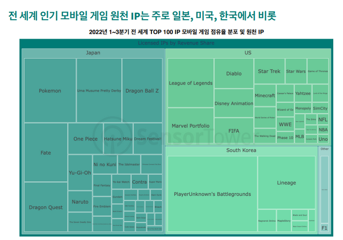 전 세계 인기 모바일 게임 원천 IP는 주로 일본과 미국, 한국에서 비롯된 것으로 나타났다. 이들 국가는 전 세계에서 가장 인기 있는 대부분의 원천 IP를 보유하고 있으며, IP 기반 모바일 게임의 97% 수익을 창출했다. 일본의 경우 ‘포켓몬’, ‘우마무스메 프리티 더비’, ‘드래곤볼’이 가장 많은 수익을 올렸고 미국은 ‘리그 오브 레전드’, ‘마블’, ‘디즈니 애니메이션’ 등이 상위권에 이름을 올렸다. 한국은 ‘배틀그라운드’와 ‘리니지’ 시리즈가 가장 많은 수익을 올렸다.