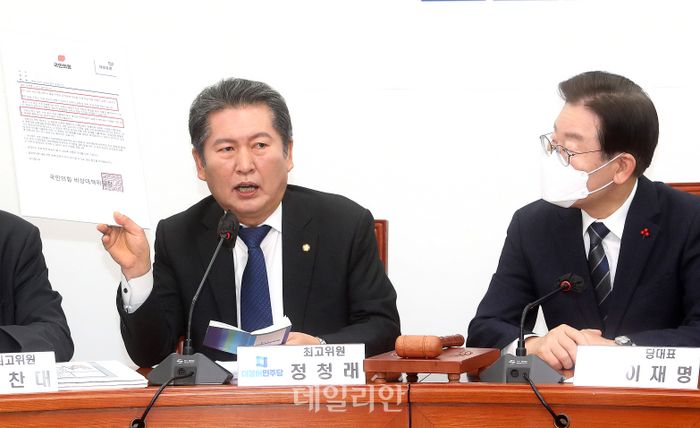 26일 오전 국회에서 열린 최고위원회의에서 이재명 대표가 국민의힘이 방송사에 보낸 '패널 구성시 공정성 준수 요청의 건' 공문 발송을 비판하는 정청래 최고위원의 발언을 듣고 있다.
