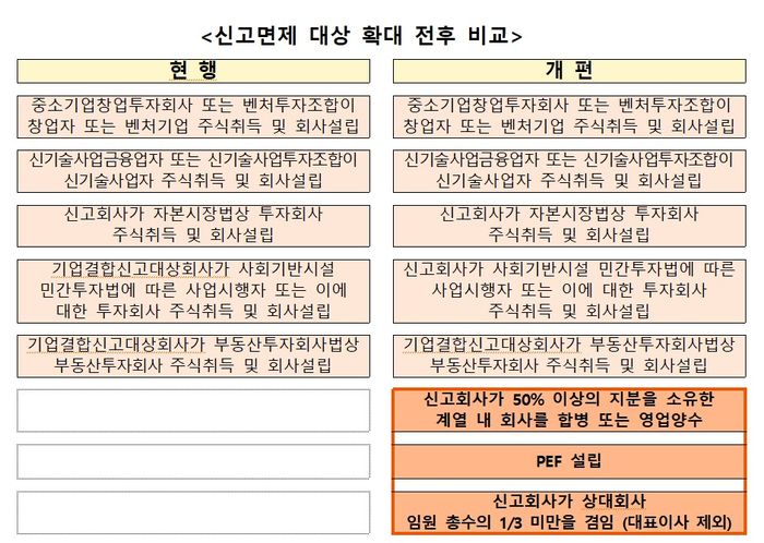 새롭게 신고의무가 면제되는 기업결합은 계열회사 간 합병·영업양수, 사모집합투자기구(PEF) 설립, 임원총수의 3분의 1 미만 임원겸임 등이다.