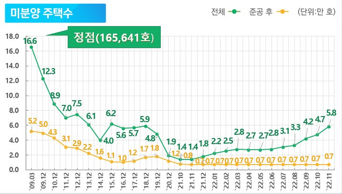 금리 인상과 경기 침체 등의 영향으로 미분양 주택이 빠른 속도로 불어나고 있다. 이 추세대로라면 정부가 위험선으로 보고 있는 6만2000가구도 다음달이면 넘어설 것으로 보인다.