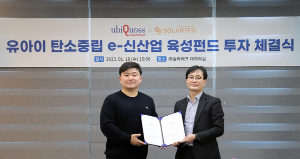 에너지 컨설팅기업 (주)솔라테크 (대표 강일구)가 유비쿼스인베스트먼트와 ‘유아이 탄소중립 e-신산업 육성펀드’ 투자계약을 체결했다고 밝혔다. 본 펀드는 한국전력이 펀드 총액의 80% 이상 투자하여 조성된 에너지신사업펀드로 신재생에너지, 친환경 모빌리티 사업분야를 주요 투자대상으로 구성하고 있다.
