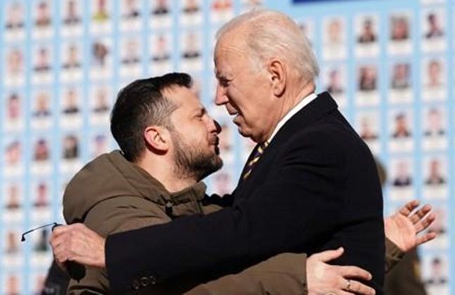 지난 20일 조 바이든 미국 대통령이 우크라이나 키이우를 방문해 볼로디미르 젤렌스키 우크라이나 대통령을 만났다. ⓒAFP/연합뉴스