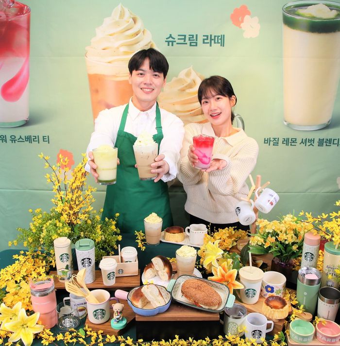 스타벅스 코리아가 매년 봄을 맞아 출시하는 ‘슈크림 라떼’를 포함해 ’핑크 플라워 유스베리 티‘, ‘바질 레몬 셔벗 블렌디드’ 등 음료 3종과 푸드 3종을 21일 출시한다고 밝혔다.