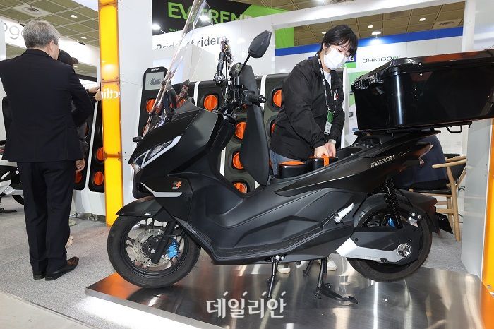 지난 15일 오전 서울 강남구 코엑스에서 열린 친환경 자동차 전시회 'EV트렌드코리아 2023'에서 부스 관계자가 전기이륜차에 배터리를 넣고 있다. ⓒ연합뉴스