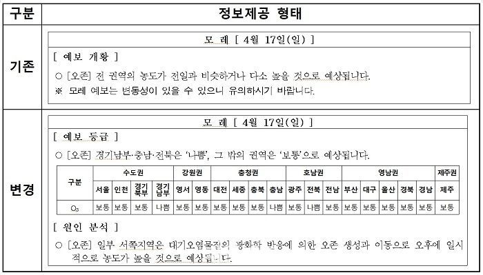 국립환경과학원은 이번 개편을 통해 이틀 뒤인 모레 오존 예보도 4단계로 세분화해 농도를 표시한다.