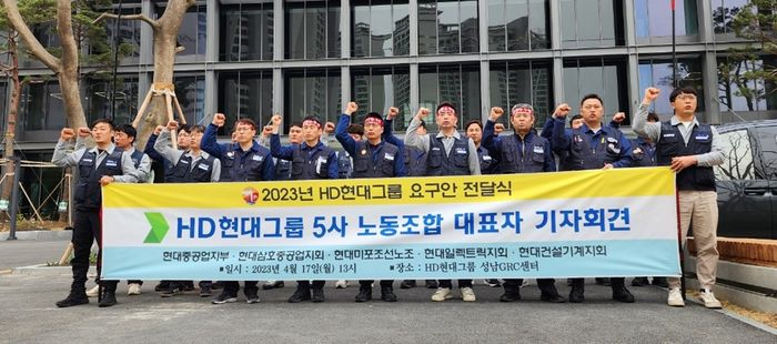 HD현대그룹 계열 5개사 노조(HD현대중공업·현대미포조선·현대삼호중공업·HD현대일렉트릭·HD현대건설기계)는 17일 경기도 성남시 글로벌R&D센터(GRC) 앞에서 ‘HD현대그룹 공동요구안 발표 5사 노조 합동 기자회견’을 열고 공동요구안 관철을 위한 공동 투쟁을 선언했다.