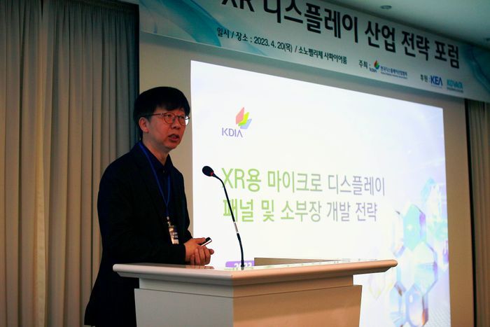 KETI 이정노 수석이 20일 열린 ‘XR 디스플레이 산업 전략 포럼’에서 '마이크로 디스플레이 패널 및 소부장 개발전략'을 주제로 발표하고 있다.ⓒ한국디스플레이산업협회