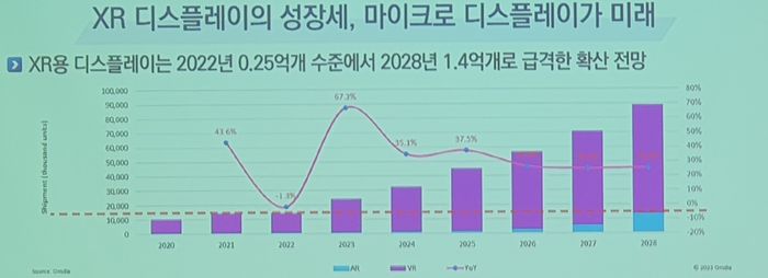 이중에서도 업계는 마이크로 디스플레이에 주목한다. 현재 XR 기기 주류는 VR로, TFT-LCD(액정디스플레이)가 대부분이나 앞으로는 마이크로 디스플레이로 시장 축이 바뀔 것이라는 전망이 우세하다. 시장조사기관인 옴디아는 마이크로 디스플레이가 2022년 253만개에서 2028년 2131만개로 늘어날 것으로 전망한다.