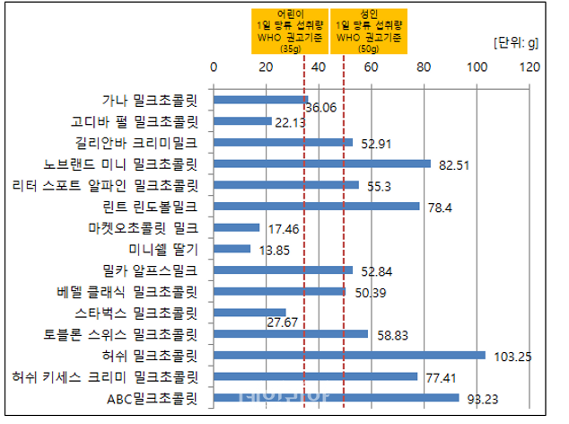 어린이가 밀크초콜릿 15개 제품 중 1개를 먹을 경우 1일 당류 섭취량 WHO 권고기준 대비 적게는 39.6%에서 많게는 295%를 섭취하게 되는 것으로 분석됐다.