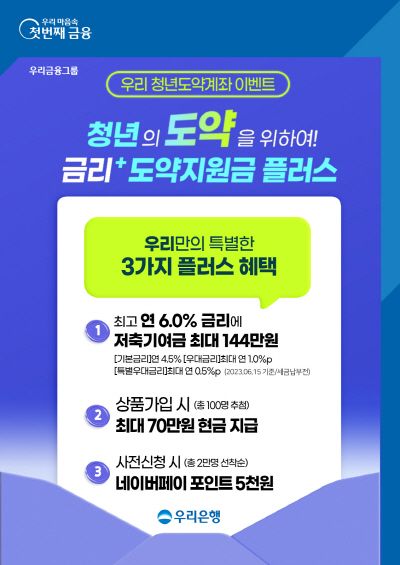 우리은행 관계자는 "청년층의 5년 후 5000만원 목돈 마련을 최우선 과제로 만기까지 상품 가입을 유지할 수 있도록 상품의 우대 조건을 확 낮췄다"며 "앞으로도 세대별 라이프 사이클에 발맞춰 고객의 자산 형성에 플러스되는 금융 상품을 제공할 수 있도록 노력할 것"이라고 말했다.