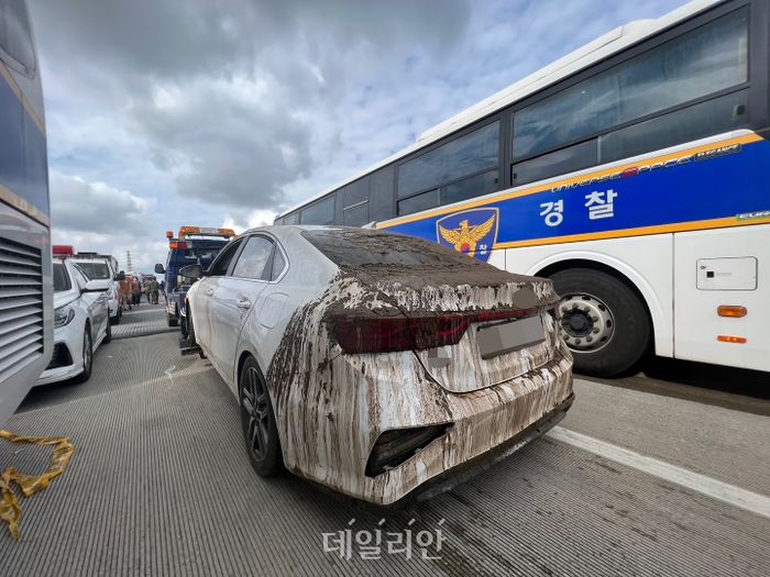 16일 오후 충북 청주 오송 궁평 2지하차도에서 침수됐던 차량이 견인차에 의해 옮겨지고 있다.