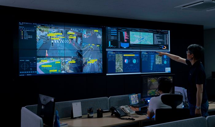 관제사들이 이노뎁 안양센터 내 ‘종합 상황실’에서 AI가 알려주는 외부 상황을 주시하고 있다.ⓒSKT