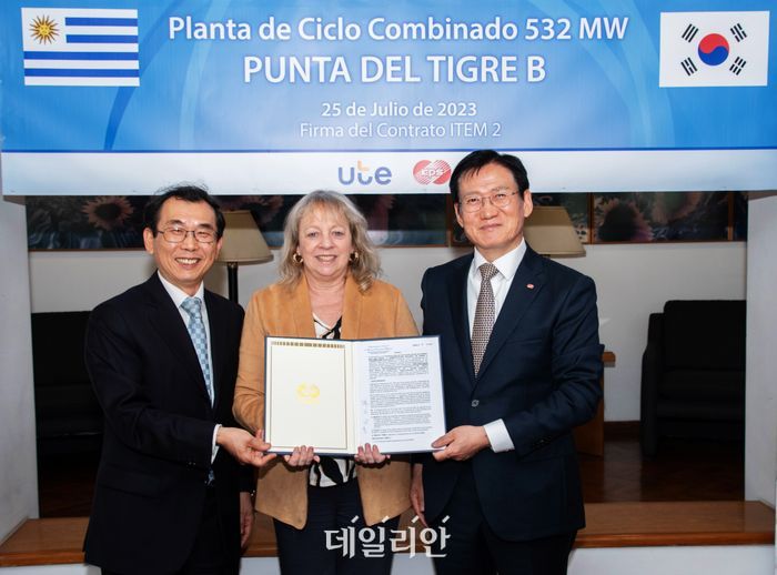 한전KPS는 26일(한국 시간) 우루과이 전력청과 티그레 발전소 O&M사업 연장계약을 체결했다. 사진 오른쪽부터 김홍연 한전KPS 사장, 실비아 에말디(Silvia Emaldi) 우루과이 전력청 사장, 이은철 주우루과이 대한민국 대사.ⓒ한전KPS