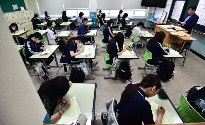 지난 6월 모의평가가 실시된 1일 오전 대구 중구 경북여자고등학교에서 3학년 학생이 배부받은 답안지를 작성하고 있다. ⓒ뉴시스