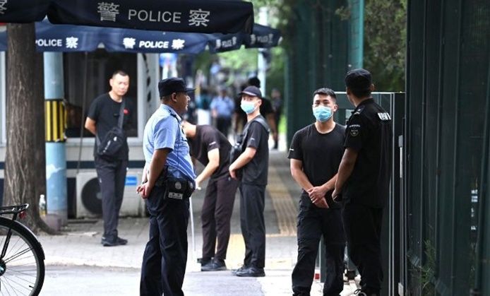 일본이 후쿠시마 제1원전의 오염수 방류를 시작해 중국에서 반일 감정이 고조되고 있는 가운데 지난 26일 중국 베이징 주재 일본대사관에서 공안(경찰)이 경계활동을 강화하고 있다. ⓒ AFP/연합뉴스