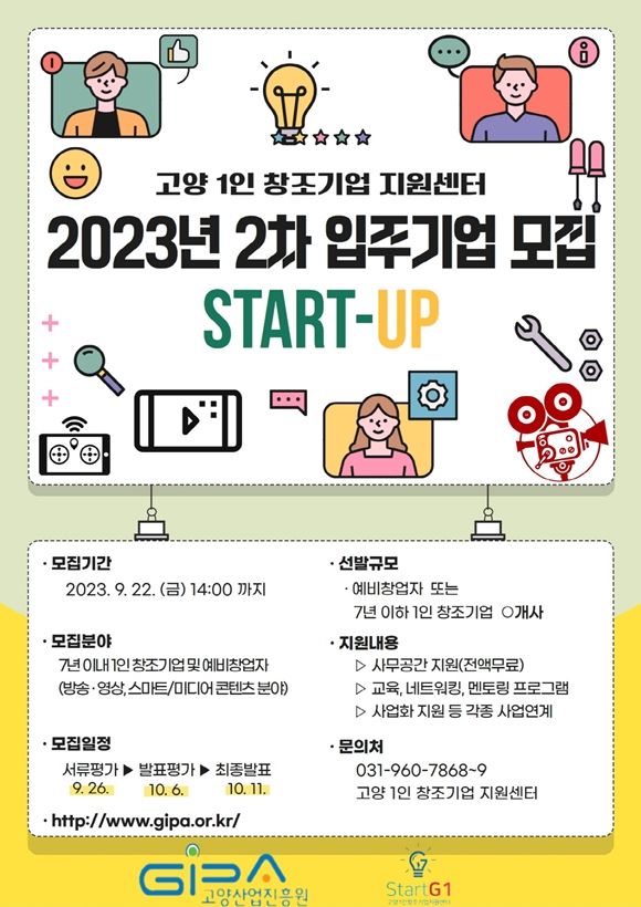 고양특례시 산하 고양산업진흥원이 운영하는 고양 1인 창조기업 지원센터(이하 지원센터)에서 2차 신규 입주기업을 9월 22일까지 모집한다.