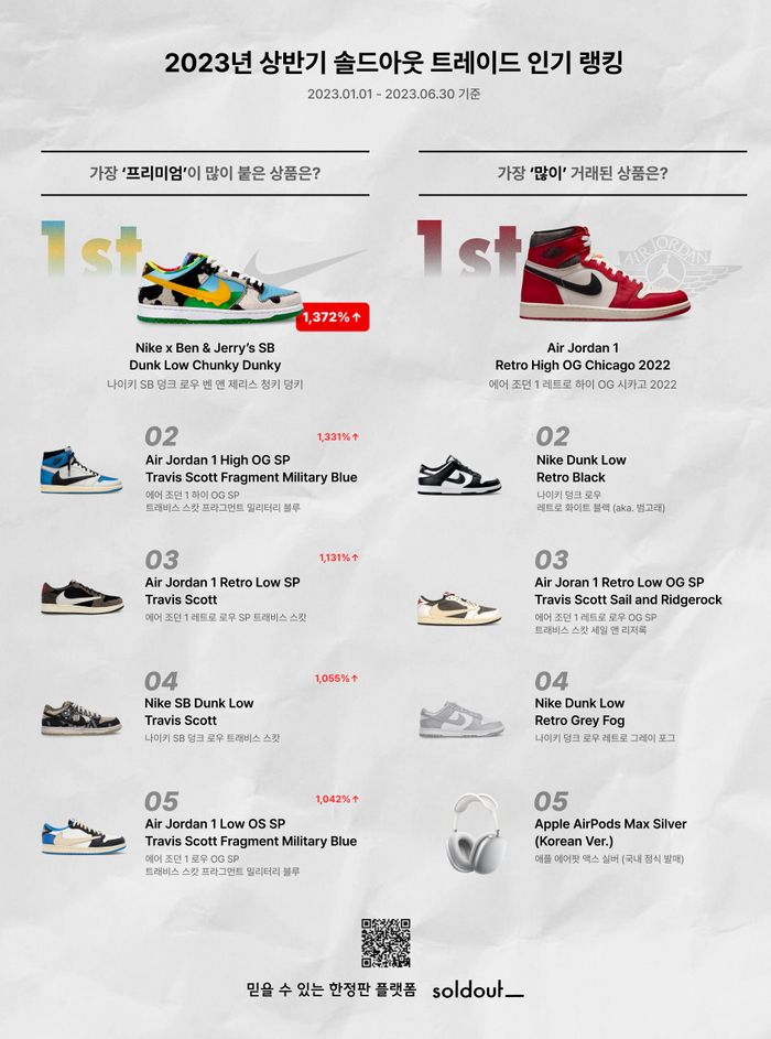 에스엘디티(SLDT)에서 운영하는 믿을 수 있는 한정판 플랫폼 솔드아웃은 올 상반기(1~6월) 개인간거래 서비스인 솔드아웃 트레이드에서 거래된 상품 중 발매가 대비 재판매 거래액이 가장 많이 오른 제품 1위는 1372% 상승한 ‘나이키 SB 덩크 로우 벤 앤 제리스 청키 덩키’인 것으로 집계됐다고 12일 밝혔다.