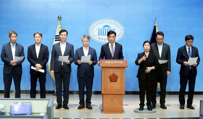 국회 과학기술방송통신위 야당 간사인 조승래 더불어민주당 의원을 비롯한 과방위원들이 12일 오후 국회 소통관에서 국민의힘 규탄 기자회견을 하고 있다. ⓒ뉴시스