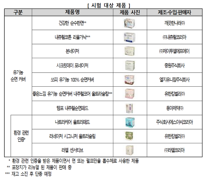 환경 관련 인증을 받은 것은 ‘나트라케어 울트라패드’, ‘라네이처 시그니처 울트라슬림’, ‘라엘 센서티브’ 등 3개 제품으로 조사됐다.