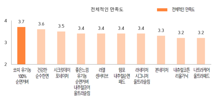 ‘건강한 순수한면’은 속옷에 생리대를 부착하는 부착 용이성과 떼어내는 제거 용이성이 모두 4.0점으로 가장 높았다. 전체적인 만족도는 ‘쏘피 유기농100% 순면커버’가 3.7점으로 가장 높았다.