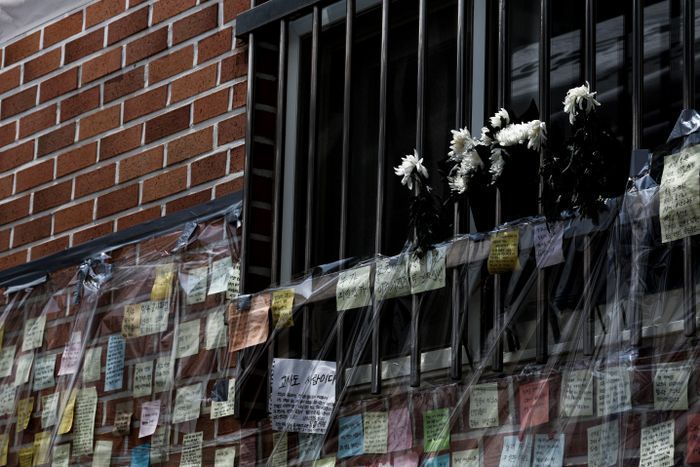 서울 서초구 서이초등학교에 담임교사 A씨를 추모하는 국화와 메모가 붙어있다.ⓒ연합뉴스