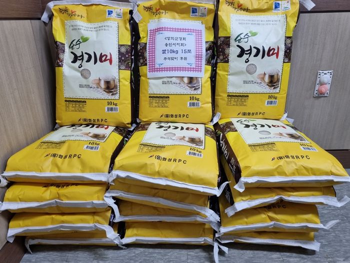 상의군경회 용인시지회가 지난 7일 역북동행정복지센터에 기탁한 50만원 상당의 백미 15포.ⓒ