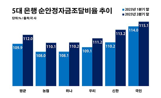 국내 주요 대형 은행들의 자금 조달 안정성이 일제히 개선된 것으로 나타났다. 높아진 금리에 힘입어 예금과 적금에 자금이 대거 몰리는 머니무브에 은행들로서는 숨통이 트이는 모습이다.