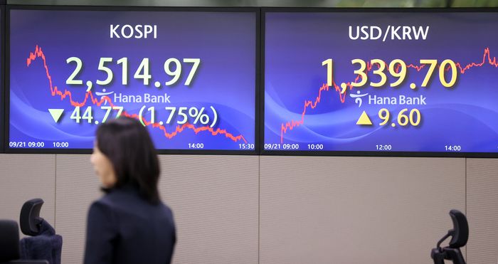 코스피가 예상보다 매파(통화긴축 선호)적으로 나온 미국 연방공개시장위원회(FOMC)의 9월 정례회의 결과를 소화하면서 2510대까지 밀렸다. 미 연방준비제도(Fed·연준)의 금리 인하가 예상보다 늦어질 것이라는 우려가 커진 가운데 코스닥은 2% 넘게 하락했다.