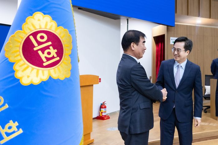 염종현 경기도의회 의장(왼쪽)과 김동연 경기도지사가 제371회 임시회 4차 본회의에 앞서 인사를 나누고 있다. ⓒ경기도 제공