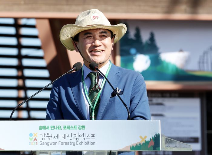 김진태 강원특별자치도지사가 22일 강원 고성군 세계잼버리수련장에서 열린 2023강원세계산림엑스포 개막식에서 개회사를 하고 있다. 김 지사는 엑스포 조직위원장을 겸하고 있다. ⓒ연합뉴스