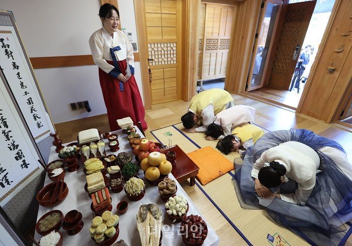 조윤주 식품명인체험홍보관장이 22일 서울 은평구 은평한옥마을 예서헌에서 열린 한국농수산식품유통공사 2023 추석차례상 시연 행사에서 모델들과 함께 전통 차례상 차림 및 차례 예법을 소개하고 있다(기사 내용과 관계 없음). ⓒ연합뉴스